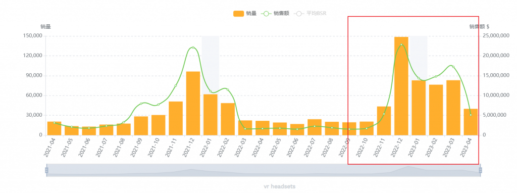 2021年“元宇宙”火爆,VR又持续被带火,作为新兴的科技类产品,VR头显在2021年的销量迎来井喷,从亚马逊美国站BSR前100的数据来看,经过2022年的沉淀,2023年VR新品频出,销量迎来明显增长,市场需求不断增长,前景较优。
